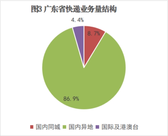 1-5月份,同城、异地、国际/港澳台快递业务量分别占全部快递业务量的8.6%、86.8%和4.6%。与去年同期相比,同城快递业务量的比重下降0.4个百分点;异地快递业务量的比重持平;国际/港澳台业务量的比重上升0.4个百分点。