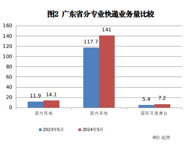 1-5月份,全省同城快递业务量累计完成14.1亿件,同比增长18.4%;异地快递业务量累计完成141.0亿件,同比增长19.7%;国际及港澳台快递业务量完成7.2亿件,同比增长34.7%。