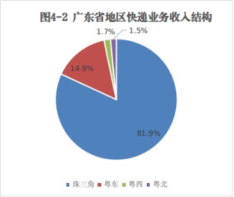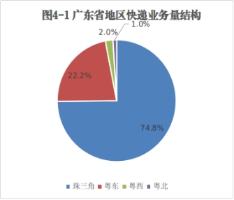 1-5月份,珠三角、粤东、粤西、粤北地区快递业务量比重分别为74.8%、22.2%、2.0%、1.0%,快递业务收入比重分别为81.9%、14.9%、1.7%、1.5%。与去年同期相比,珠三角地区快递业务量比重上升了2.8个百分点,快递业务收入比重上升了0.4个百分点;粤东地区快递业务量比重下降了3.2个百分点,快递业务收入比重下降了0.8个百分点;粤西地区快递业务量比重上升了0.2个百分点,快递业务收入比重上升了0.2个百分点;粤北地区快递业务量比重上升了0.2个百分点,快递业务收入比重上升了0.2个百分点。